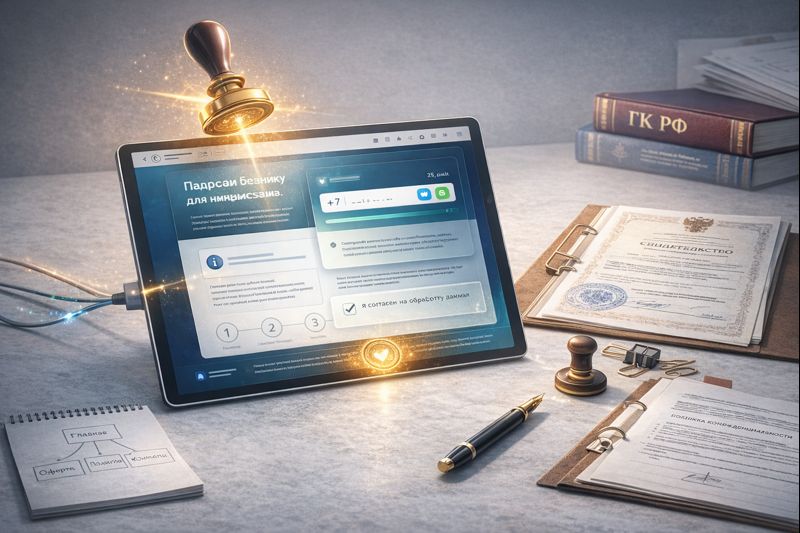 - Политика обработки персональных данных и Согласие на обработку данных (чекбокс в форме должен быть обязательным).